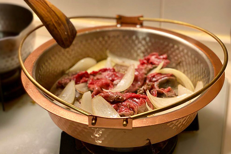 - Heat oil with a shallow pan, sauté onion until soft. Add beef slices and slightly stir-fry until they turn brown (do not over-cook). Add in sauce and bring to a boil.